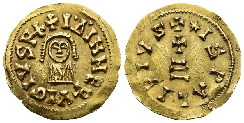 2471   -  REINO VISIGODO. LIUVA II. Tremissis. Ispali. Falsificación del S. XIX. AU 1,43 g. 18,1 mm. CNV-no. Chaves-F32, mismo ejemplar ilustrado. MBC.- Rara. Ex colección Chaves.