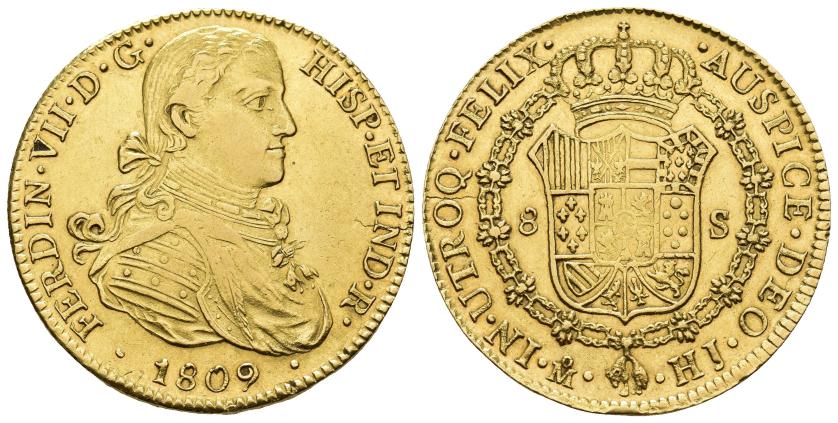 2606   -  FERNANDO VII. 8 escudos. 1809. Nuevo Reino. JF. AU 26,93 g. 36,4 mm. VI-1498. Múltiples golpecitos y rayitas. Limadura en canto. BC+/MBC-.