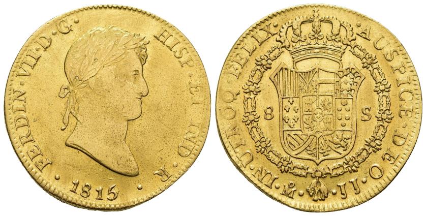 2605   -  FERNANDO VII. 8 escudos. 1815/4. México. JJ. AU 26,96 g. 37,4 mm. VI-1489. Ligeras trazas de limpieza. R.B.O. MBC/EBC-. Escasa.