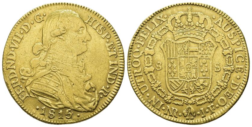 FERNANDO VII. 8 escudos. 1816. Popayán. PR. Marca de ceca PN. AU 27,08 g. 38,1 mm. VI-1527. Acuñación floja en rev. R.B.O. EBC-/MBC+. Muy escasa.