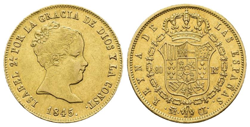 2622   -  ISABEL II. 80 reales. 1845. Madrid. CL. AU 6,78 g. 20,9 mm. VI-603. Golpecito en canto. R.B.O. EBC-/EBC.