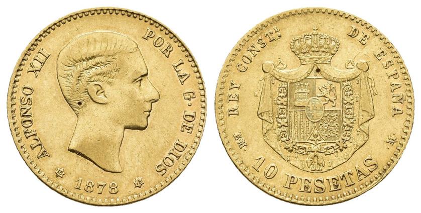 2624   -  ALFONSO XII. 10 pesetas. 1878 *18-78. Madrid. EMM. AU 3,19 g. 19,1 mm. VII-97. Pequeño punzón en anv. MBC+/EBC-.