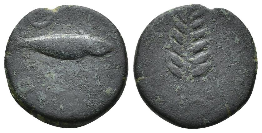 HISPANIA ANTIGUA. ILIPA. Cuadrante. A/ Espiga. R/ Sábalo a der., detrás creciente, debajo entre líneas ¿tres puntos? AE 3,54 g. 18,57 mm. I-1546? ACIP-2339. Pátina oscura. BC. Rarísima. Ex Áureo, 20-9-1995, lote 354.