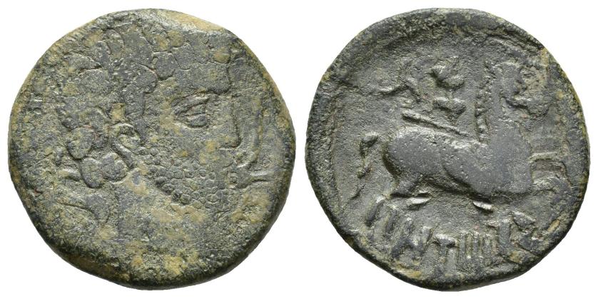 2308   -  HISPANIA ANTIGUA. TURRIREGINA. As. A/ Cabeza con casco a der., alrededor corona de hojas de hiedra. R/ Racimo (no visible) y espiga a izq., en medio entre líneas TVRRIREGINA. AE 16,58 g. 32,67 mm. I-2466. ACIP-960. Campos de rev. repasados. Cospel irregular. Pátina verde. BC+. Muy rara. Ex Áureo, 4-3-1998, lote 1503.