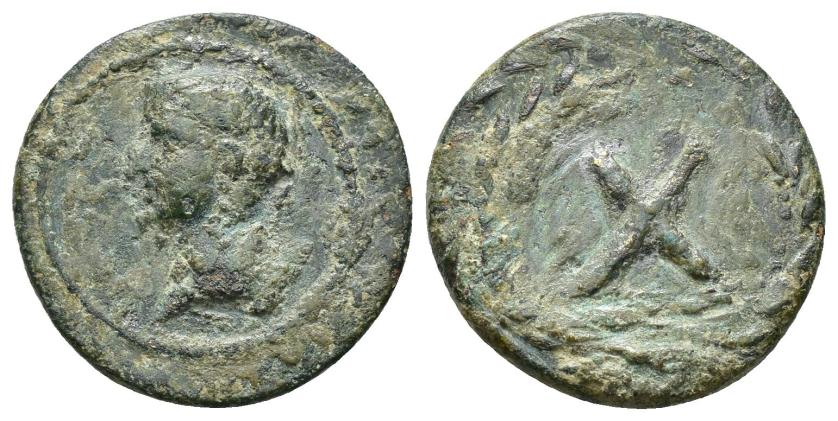 IMPERIO ROMANO. TIBERIO. Tésera anónima (c. 14-37 d.C.). A/ Cabeza laureada a izq. Dentro de gráfila lineal y láurea poco visible. R/ X dentro de láurea. AE 4,34 g. 20,7 mm. Buttrey-16? (var. X rev.). Trazas de limpieza mecánica. BC-/MBC-.