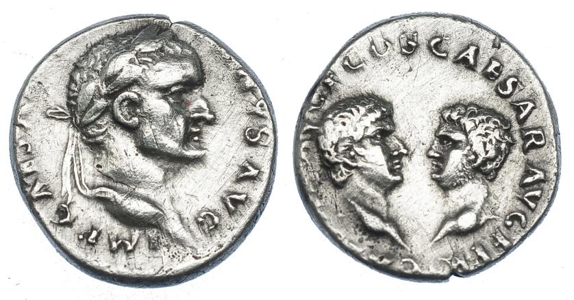 IMPERIO ROMANO. VESPASIANO. Denario. Roma (70 d.C.). A/ Cabeza laureada a der. R/ Cabezas afrontadas de Tito y Domiciano; (CAESAR) AVG F COS CAESAR AVG F P R. AR 3,40 g. 17,3 mm. RIC-16. MBC. Muy escasa.