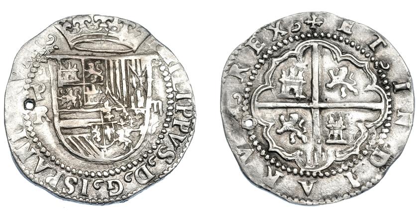 511   -  FELIPE II. 2 reales. S/F. Potosí. R. AC-364. Agujerito. MBC. Muy redonda. Escasa.