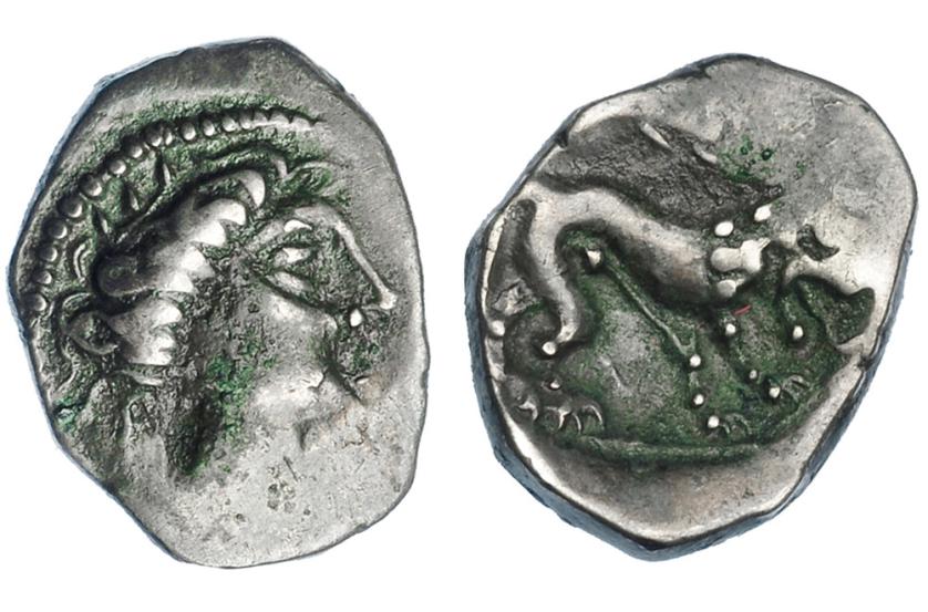 GRECIA ANTIGUA. GALIA. Bituriges. Dracma. A/ Cabeza masculina a der. R/ Auriga conduciendo caballo a der., debajo figura con brazos abiertos. AR 2,28 g. 16,11 mm. BC+/MBC. Ex colección Guadán 1255.