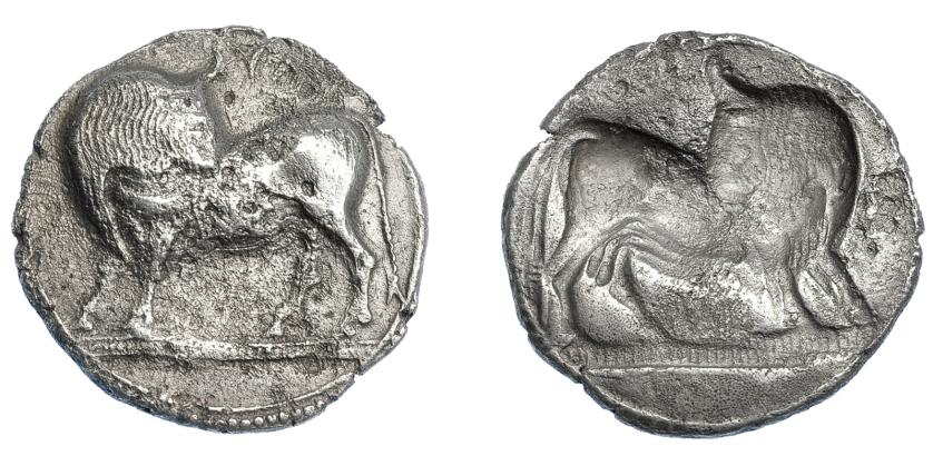 GRECIA ANTIGUA. LUCANIA. Síbaris. Estátera (560-510 a.C.). A/ Toro a izq. con cabeza vuelta, encima SU invertida. R/ Incuso. AR 7,54 g. 26,46 mm. COP-1390. SBG-245 vte. Erosiones. MBC-. Rara. Ex Guadán 1444.
