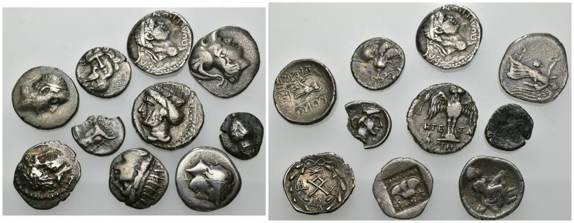 GRECIA ANTIGUA. Lote de 10 divisores en plata diferentes: Amisos, Polemon II, Polyrenium, Pale, Keos, Elis, Milasa, Rodas, Side, Ariobarzanes I. Pesos de 0,74 a 5,27 g. Uno con roturas al borde. BC+/MBC. Todas ex colección Guadán.