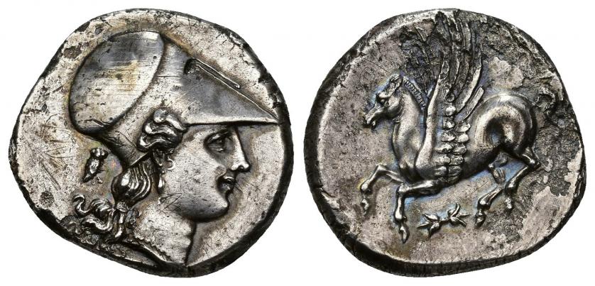 GRECIA ANTIGUA. SICILIA. Siracusa. Estátera (310-304 a.C.). A/ Cabeza de Atenea a der., detrás lechuza. R/ Pegaso volando a izq., debajo haz de rayos. AR 6,3 g. 21,41 mm. COP-781. SBG-976 vte. Rayitas y erosiones. EBC. Ex colección Guadán, 1658.