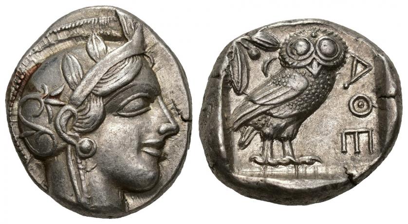 GRECIA ANTIGUA. ÁTICA. Atenas. Tetradracma (c. 479-393 a.C.). A/ Cabeza de Atenea a der. R/ Lechuza a der. AR 17,20 g. 23,08 mm. COP-34 ss. Pequeña grieta. MBC+/EBC-.