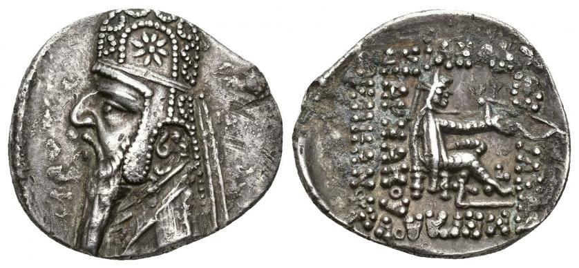 GRECIA ANTIGUA. REYES DE PARTIA. Fraates IV (38-2 a.C.). Dracma. Ecbatana. A/ Detrás del busto, águila con corona en el pico. R/ Monograma debajo del arco. AR 3,67 g. 20,28 mm. SEP-52.10. MBC.