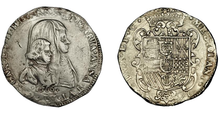 CARLOS II Filipo. 1666. Milán. A/ Busto de Carlos y Mariana de Austria. Crippa-2. Olivares-277. Rayitas en anv. MBC+/EBC-. Muy escasa.