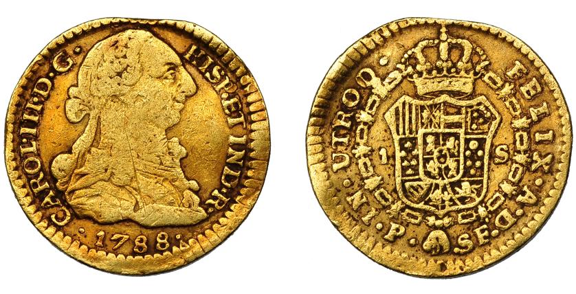534   -  CARLOS III. Escudo. 1788. Popayán. SF. VI-1211. Ligeramente alabeada. Raya en anv. BC+.