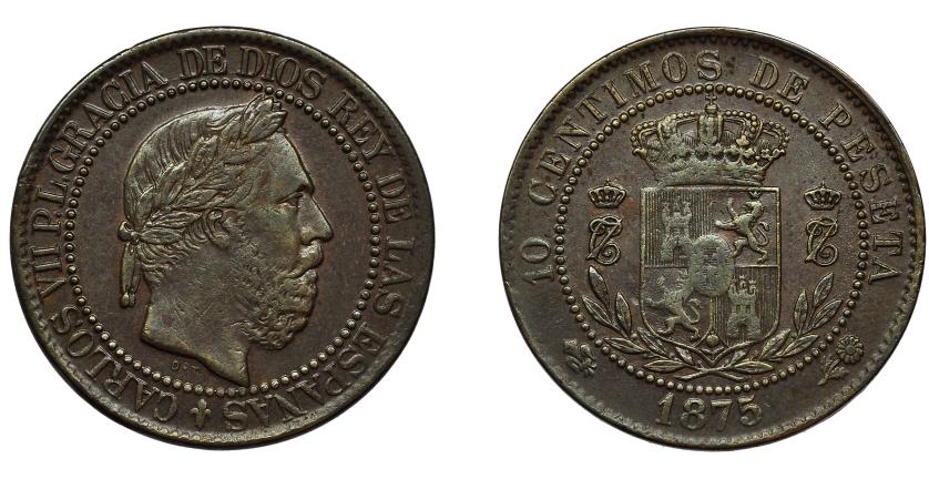 629   -  CARLOS VII. 10 céntimos. 1875. Bruselas. No coincidente en eje horizontal. VII-117. MBC/MBC-.