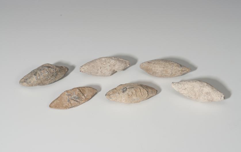 ROMA. República Romana. Lote de seis glandes bicónicos (I a.C.). Plomo. Tres con monograma AVF. Longitud 5,0-5,1 cm.