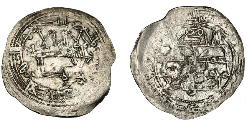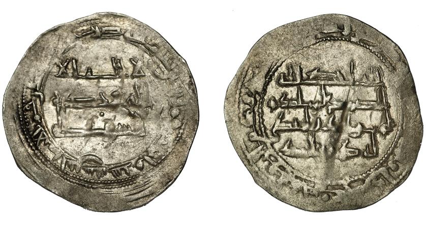 377   -  EMIRATO INDEPENDIENTE. Abd al-Rahman III. Dirham. Al-Andalus. 330 H. AR 2,44 g. 25 mm. V-396. Pequeña grieta. MBC-.