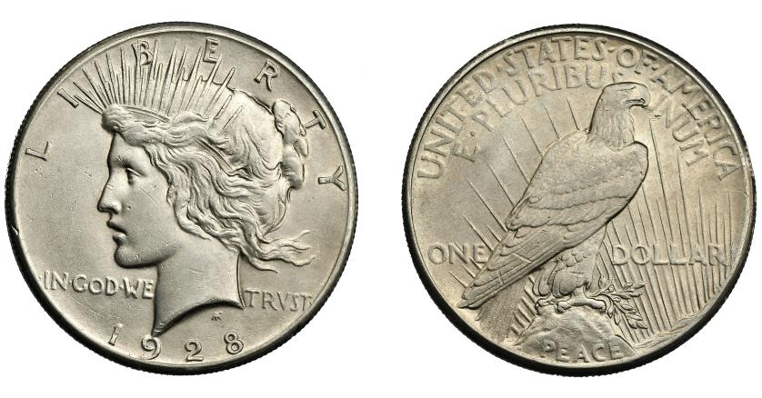 MONEDAS EXTRANJERAS. ESTADOS UNIDOS DE AMÉRICA. 1 dólar. 1928. Filadelfia. KM-150. Pequeñas marcas. EBC. Rara.