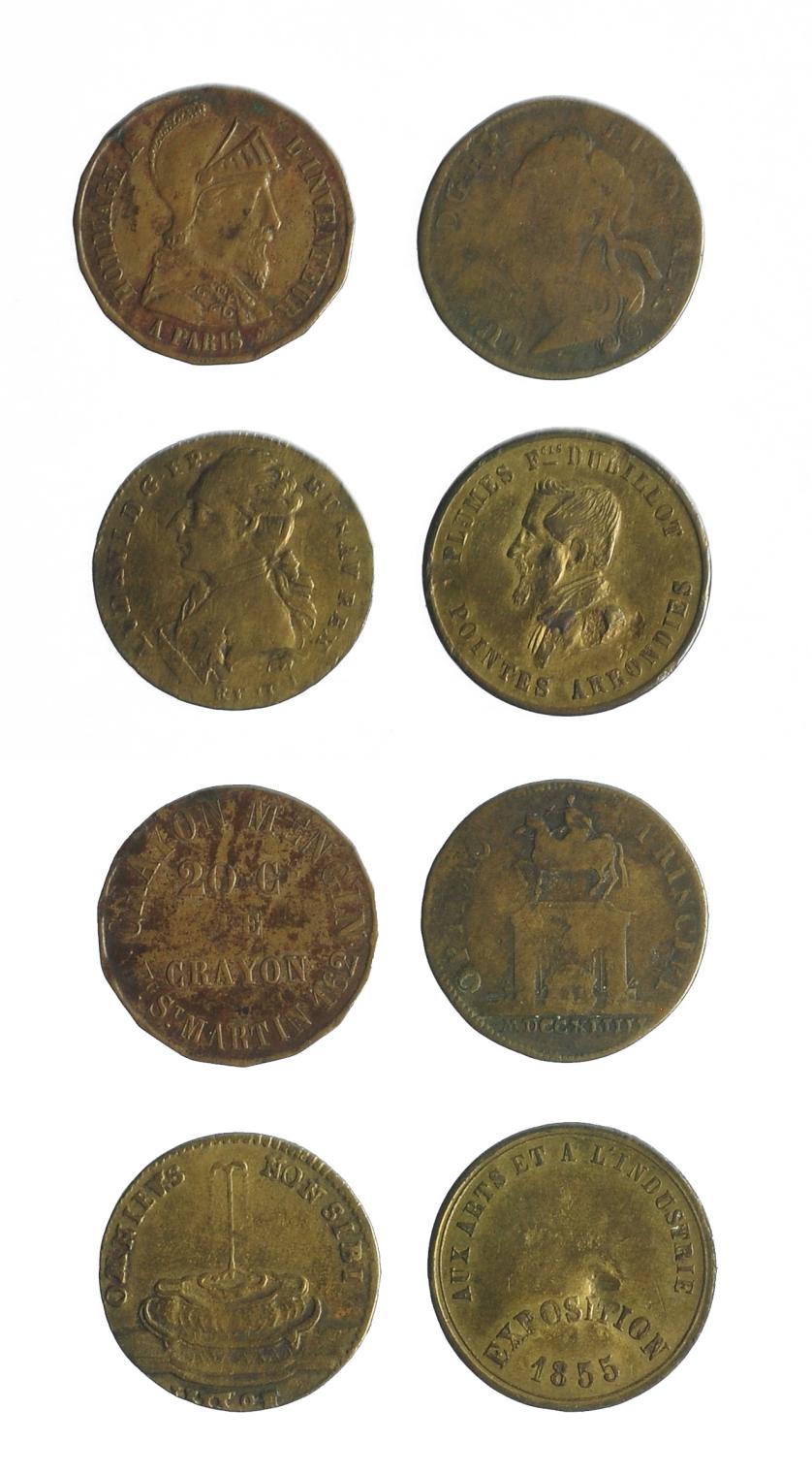 MONEDAS EXTRANJERAS. FRANCIA. Lote de 4 jetones: Luis XIV (1744), Luis XVI (Letton) y publicitario (2: 1855 y Crayon Mengin). BC/MBC.