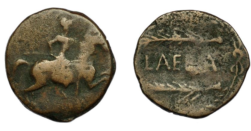 HISPANIA ANTIGUA. LAELIA. As. A/ Jinete lancero a der. R/ Dos espigas a izq., en medio LAELIA, alrededor láurea. AE 7,79g. 25,4 mm. I- 1649. ACIP-2368. BC. Muy escasa.