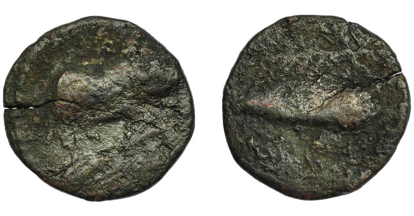 105   -  HISPANIA ANTIGUA. ITUCI. Unidad. A/ Jinete con rodela y lanza a izq. debajo ley. fenicia. R/ Dos espigas entre glóbulos, creciente y glóbulo en el medio. AE 11,18 g. 23,4 mm. I-1602. ACIP- 841. BC+. Rara