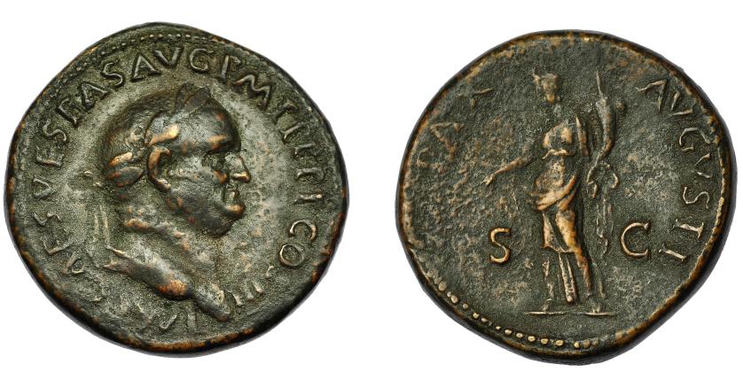 IMPERIO ROMANO. VESPASIANO. Sestercio. Roma (71 d.C.). R/ Pax a izq. con rama y cornucopia; PAX AVGVSTI, S-C. AE 26,84 g. 32,6 mm. RIC-243. Limpieza mecánica. MBC-.