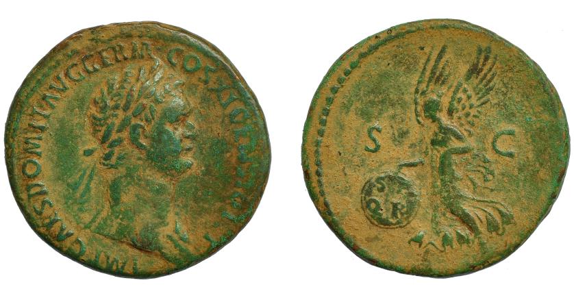 300   -  IMPERIO ROMANO. DOMICIANO. As. Roma (85 d.C.). R/ Victoria avanzando a izq. con escudo en el que se lee SPQR, S-C. RIC-388. Pátina verde claro. MBC-.