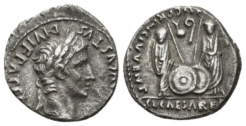 PERIODO DE JULIO CÉSAR A AUGUSTO. AUGUSTO. Denario. Lugdunum (7-6 a.C.). A/ Cabeza laureada de Augusto a der. R/ Cayo y Lucio con lanzas y escudos, en el centro símpulo y lituus y escudo izq. por delante del derecho; C L CAESARES AVGVSTI F COS DESIG PRINC IVVENT. AR 3,71 g. 18,8 mm. RIC-207. FFC-22. Superficies ligeramente erosionadas. MBC.