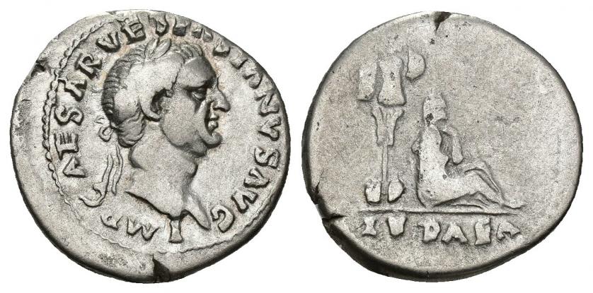 3158   -  IMPERIO ROMANO. VESPASIANO. Denario. Roma (69-71 d.C.). A/ Cabeza laureada a der.; IMP. CAESAR VESPASIANVS AVG. R/ Judea sentada a der. bajo trofeo; IVDAEA. AR 3,25 g. 18,63 mm. RIC-2. Cospel abierto. MBC-./BC+. Muy escasa.