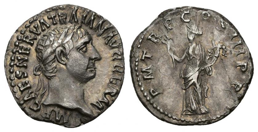 IMPERIO ROMANO. TRAJANO. Denario. Roma (100). A/ Cabeza laureada a der.; IMP CAES NERVA TRAIAN AVG GERM. R/ Pax a izq. con rama y cornucopia; P M TR P COS III P P. AR 3,12 g. 18,52 mm. RIC-38. MBC/MBC+.