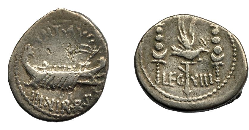 178   -  PERIODO DE JULIO CÉSAR A AUGUSTO. MARCO ANTONIO. Denario. Ceca móvil (32-31 a.C.). A/ Galera a der. R/ Aquila entre dos signa; LEG VIII. AR 3,77 g. 19,2 mm. CRAW-544.21. FFC-39. Contramarcas. MBC-.
