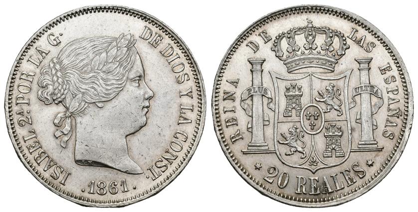 569   -  ISABEL II. 20 reales. 1861. Madrid. AR  mm. VI-25,91 g. 37,4 mm. VI-517. Pequeñas marcas. EBC.