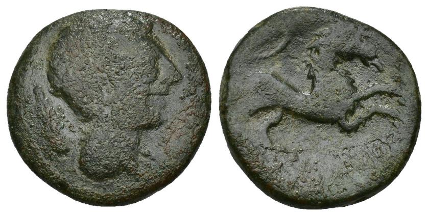 163   -  HISPANIA ANTIGUA. TURRIREGINA. As. A/ Cabeza con casco a der., alrededor corona de hojas de hiedra. R/ Racimo (no visible) y espiga a izq., en medio entre líneas TVRRIREGINA. AE 16,58 g. 32,67 mm. I-2466. ACIP-960. Campos de rev. repasados. Cospel irregular. Pátina verde. BC+. Muy rara. Ex Áureo, 4-3-1998, lote 1503.