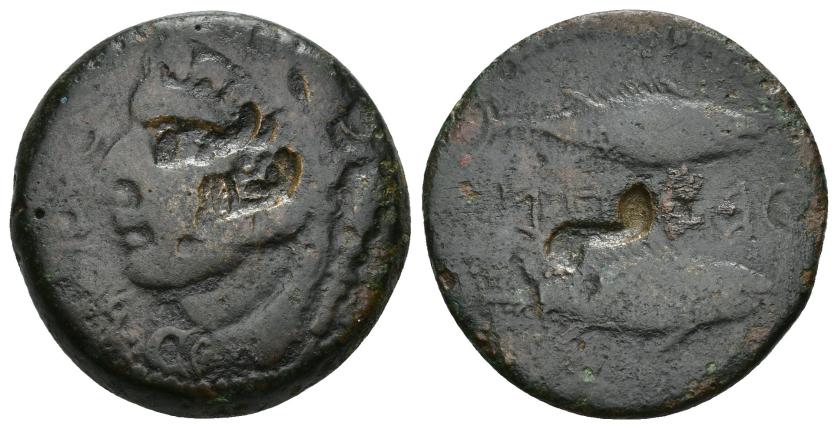 109   -  HISPANIA ANTIGUA. BEUIPO-SALACIA. Unidad. A/ Cabeza masculina a der., delante SISVC (.A). R/ Dos delfines a izq., en medio ley. sudlusitana BEUIBUM parcialmente visible. AE 15,78 g. 27,4 mm. CNH-7 corr. ACIP-978. CC-3050, mismo ejemplar. Contramarca circular en rev. Pátina oscura. BC-. Muy rara.
