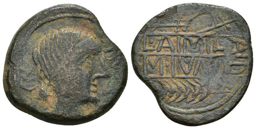 134   -  HISPANIA ANTIGUA. OBULCO. As. A/ Cabeza femenina con moño a der., delante OBVLCO, detrás creciente y X. R/ Arado y espiga a izq., debajo entre líneas L AIMIL/ M INI, en vertical AID. AE 18,17 g. 29,2 mm. I-1817. ACIP-2228. Vano en anv. y erosión en rev. MBC. Muy rara.