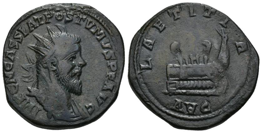 IMPERIO ROMANO. PÓSTUMO. Sestercio. Lugdunum (261-263). R/ Busto radiado y drapeado a der.; IMP C M CASS LAT POSTVMVS P F AVG. R/ Galera a der. con remeros y timonel; LAETITIA / AVG. AE 22,72 g. 33,98 mm. RIC-143. Pátina oscura. MBC.