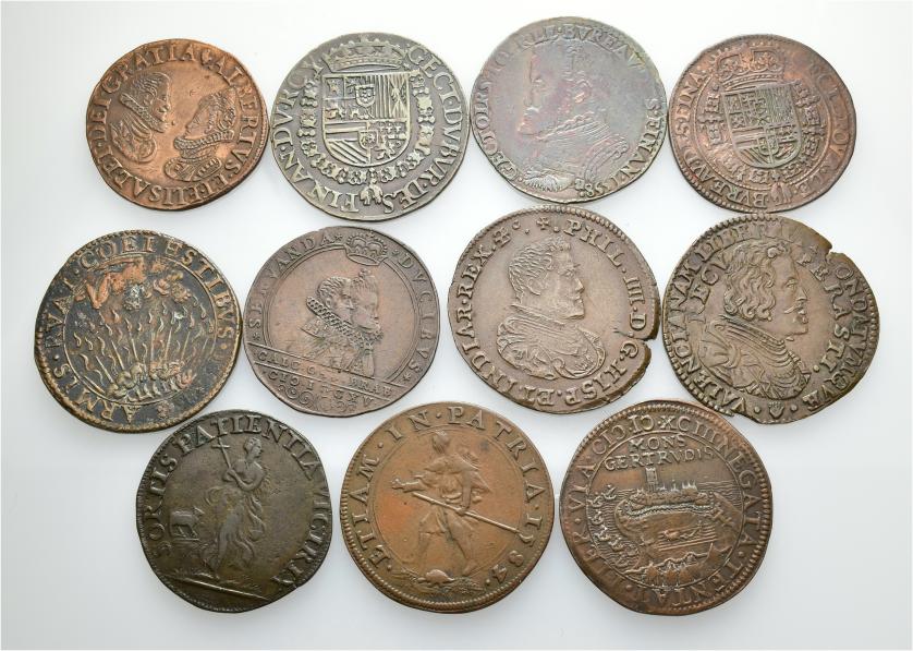 FELIPE II. Lote de 11 jetones de Países Bajos: Felipe II (2), Isabel y Alberto (2), Felipe IV (3), otros (4). De MBC- a EBC-.