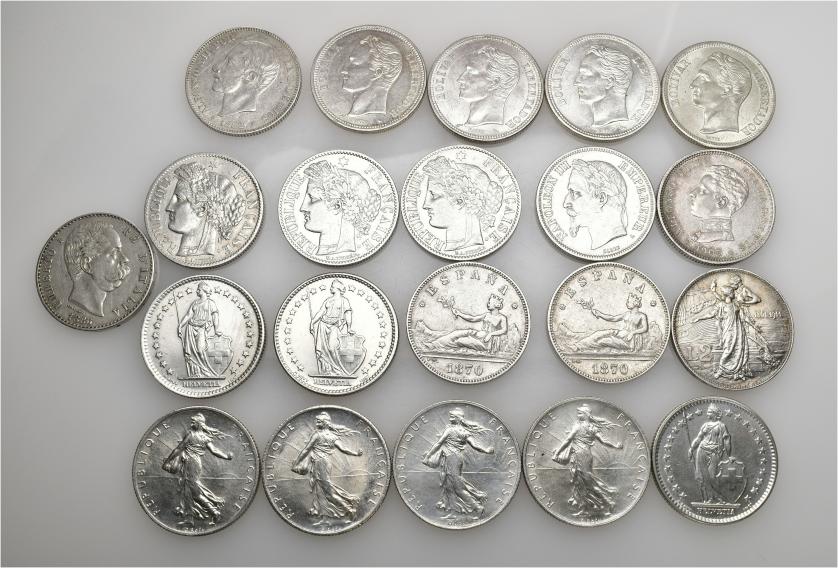 MONEDA EXTRANJERA. Lote de 21 monedas de plata: 2 pts. España 1870 -2: 18*74 y 18*75-, 1882 y 1905; 2 francos de Francia: 1869, 1871, 1881, 1887, 1915, 1916, 1917 y 1918; 2 liras de Italia: 1886 y 1911; 2 francos de suiza: 1963, 1965 y 1967 y 2 bolívares Venezuela: 1945, 1960 y 1965 (2). MBC/EBC.