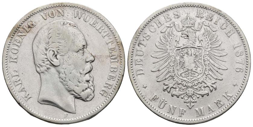 MONEDA EXTRANJERA. ALEMANIA Y ESTADOS ALEMANES. WÜRTTEMBERG. Carlos. 5 marcos. F. 1876. AR 27,32 g. 38,2 mm. KM-no. MBC-/MBC.