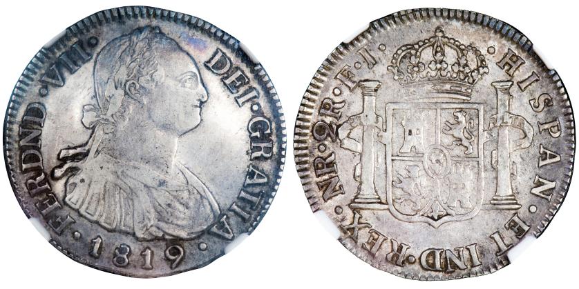 FERNANDO VII. 2 reales. 1819. Nuevo Reino. FJ. AR. VI-735; AC-935. Encapsulada NGC-XF 45. MBC.