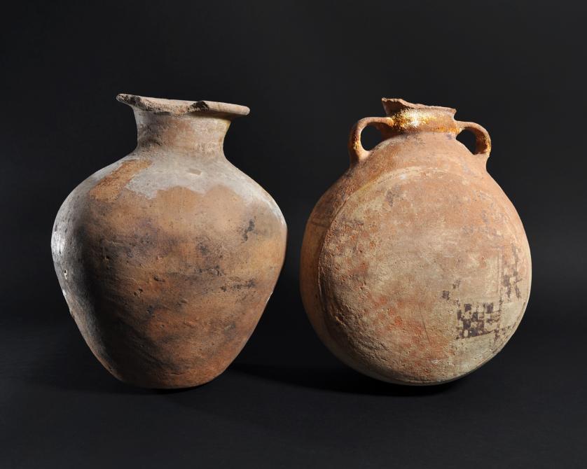 ARQUEOLOGÍA. PREHISPÁNICO. Cultura Guangala. Lote de 2 vasijas con decoración geométrica (100 a.C.-500 d.C.). Cerámica. Altura de 28,5 a 29 cm. Presentan falta en sus bocas y restos de humedad. Una de ellas con número de catalogación antiguo.