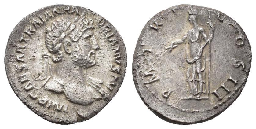 IMPERIO ROMANO. ADRIANO. Denario. Roma (136). A/ Cabeza laureada a der.; HADRIANVS AVG COS III P P. R/ Moneta a izq. con balanza y cornucopia; MONETA AVG. AR 3,14 g. 15,5 mm. RIC-2223. MBC.