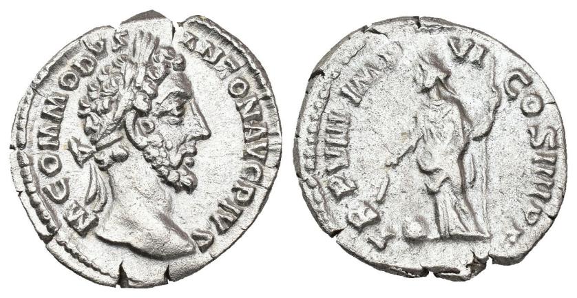 IMPERIO ROMANO. CÓMODO. Denario. Roma (183). A/ Cabeza laureada a der.; M COMMODVS ANTON AVG PIVS. R/ Providentia a izq. con cetro, vara y globo a sus pies; TR P VIII COS IIII P P. AR 2,89 g. 17,8 mm. RIC-65. MBC+/MBC.