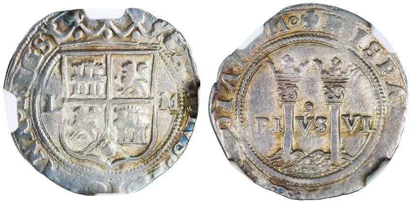 JUANA Y CARLOS. Real. S/F. México. M-O. AR 3,24 g. AC-74. Encapsulada NGC-VF 25. MBC-.