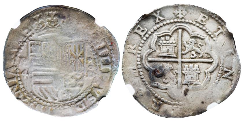 FELIPE II. 8 reales. S/F. Potosí. B. AR 27,07 g. AC-672. Encapsulada NGC-AU 50. Manchas de óxido. MBC+/MBC.