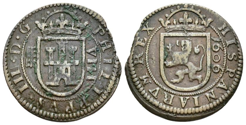 FELIPE III. 8 maravedís. 1606. Segovia. CU 5,7 g. 27,3 mm. AC-329. Final de plancha. Leves oxidaciones. MBC.