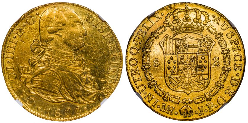 CARLOS IV. 8 escudos. 1808. Lima. JP. AU. VI-1317; AC-1616. Encapsulada NGC-AU DETAILS. Hojas y rayitas en anv. y rev. Limpiada y abrillantada. MBC-/MBC.