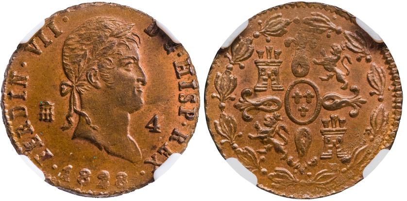 FERNANDO VII. 4 maravedís. 1828. Segovia. CU. VI-187; AC-182. Encapsulada NGC-MS 64 BN. Pequeños vanos. B.O. EBC+.