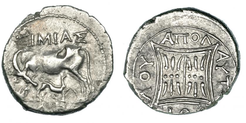121   -  ILIRIA. APOLONIA. Dracma. Post. 229 a.C. A/ Vaca amantando ternero a izq. R/ Cuadrado con decoración. AR 2,60  g. COP-No. SBG-1879 (vte.). Ligeramente descentrada. MBC/MBC+.